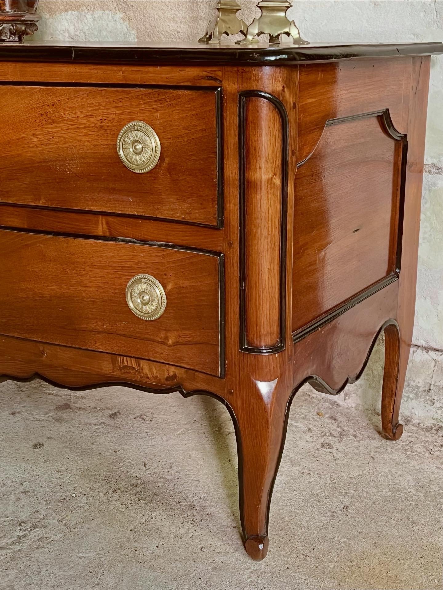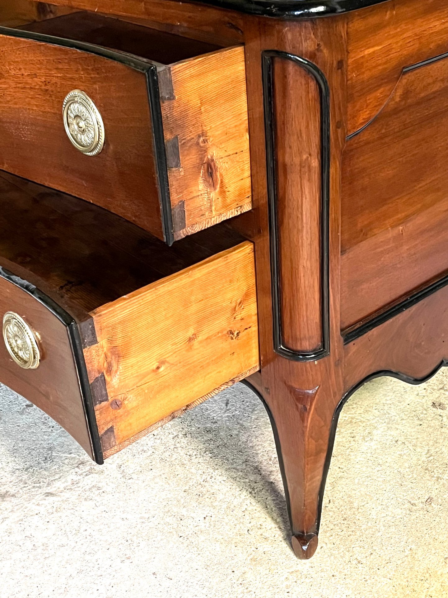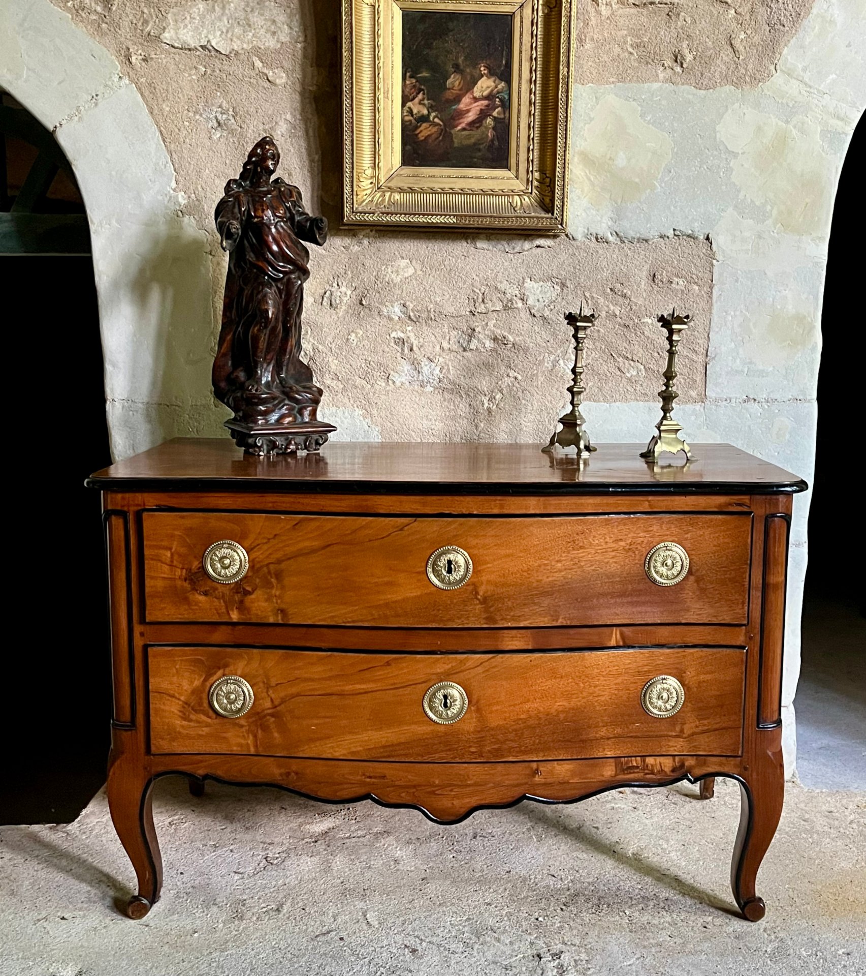 Elegant, with pure lines, chest of drawers opening with two drawers on the front attributed to Jean-François Hache. The front is curved, the lower crosspieces are scalloped both on the front and on the sides. It rests on four curved feet ending in "lozenges" which is one of the characteristics of the production of JF Hache. Trace of stamp. In light walnut from Dauphiné. Interiors of drawers and back in fir. Drawer bottoms altered (see photos) Length 125.5 cmDepth 66 cm Height 81 cm A similar chest of drawers is published in the work "Le Génie des Hache" by Pierre Rouge and François Rouge, page 248, No 111. Jean-François Hache (1730-1796) son of Pierre Hache (1703-1773) and grandson of Thomas Hache (1664-1747) Born on January 10, 1730 in Grenoble, apprenticed to his father Pierre Hache from the age of 16, established on his own account from 1754, appointed in 1770, following his father, cabinetmaker to the Duke of Orleans, Jean-François Hache is the heir to a dynasty of cabinetmakers which spans four generations (Noël - Thomas - Pierre) and lasts for almost 150 years old. Jean-François is certainly the most famous of all, but shares with his father and grandfather the reputation of the greatest provincial cabinetmaker, considered in fact, even more than the famous Couleru, as capable of rivaling the greatest Parisian master cabinetmakers. It is almost certain that Jean-François Hache stayed with Jean-François Oeben, the King's cabinetmaker, and the latter would probably even have visited the Hache family, very interested in their native wood veneers.