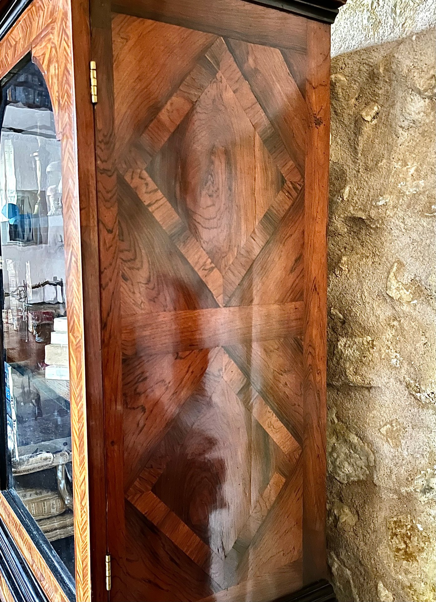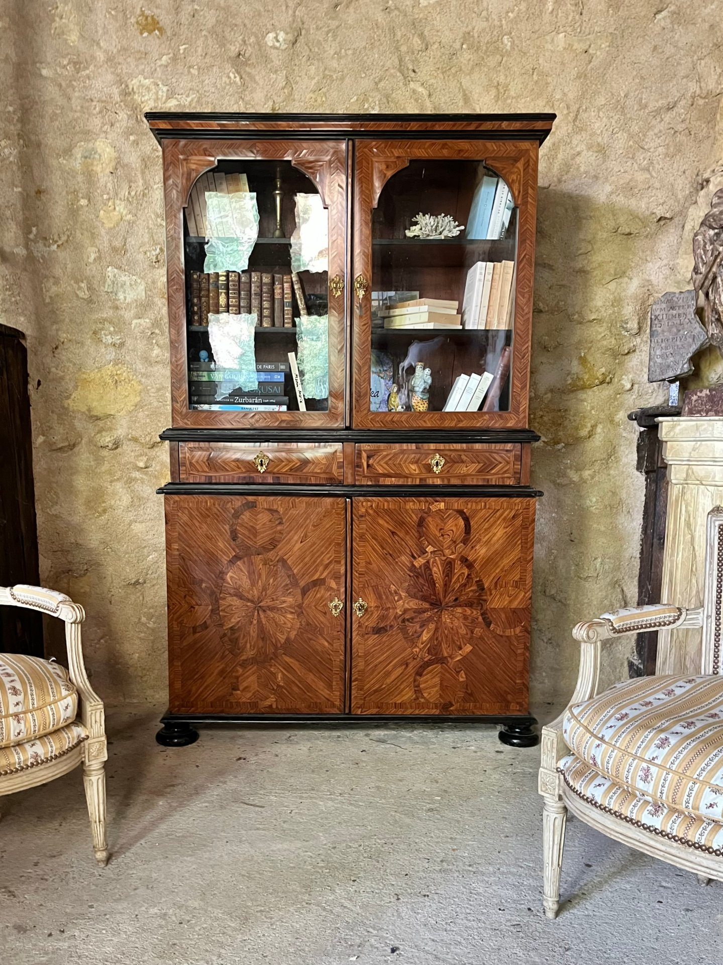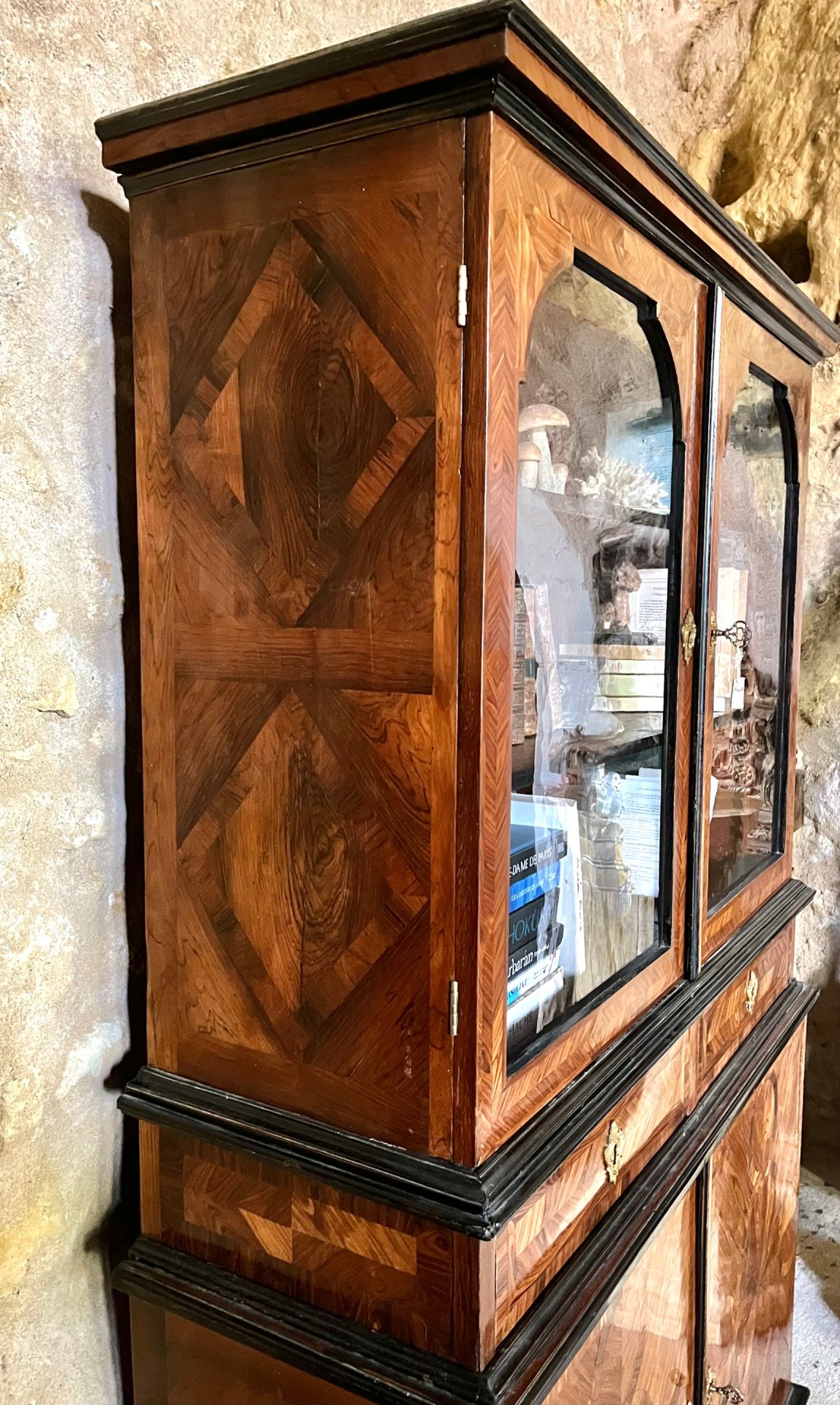 Elegant display case in violet wood marquetry, Louis XIV period. Opening with two drawers and four doors. Two-part, the drawers being attached to the upper part. It rests on two loaf feet on the front. Cornices and feet in blackened pear wood. The shelves, fittings and locks are original.