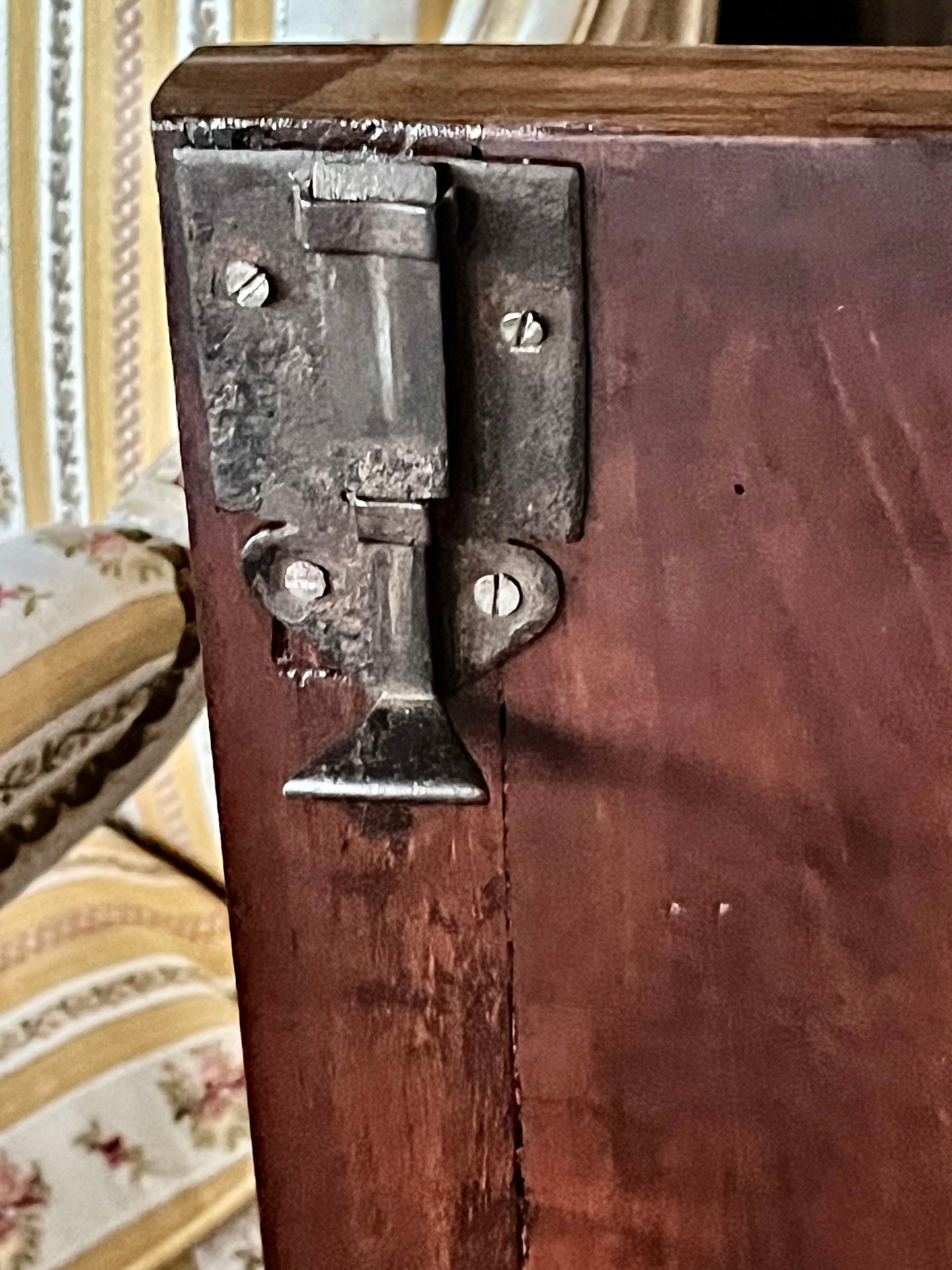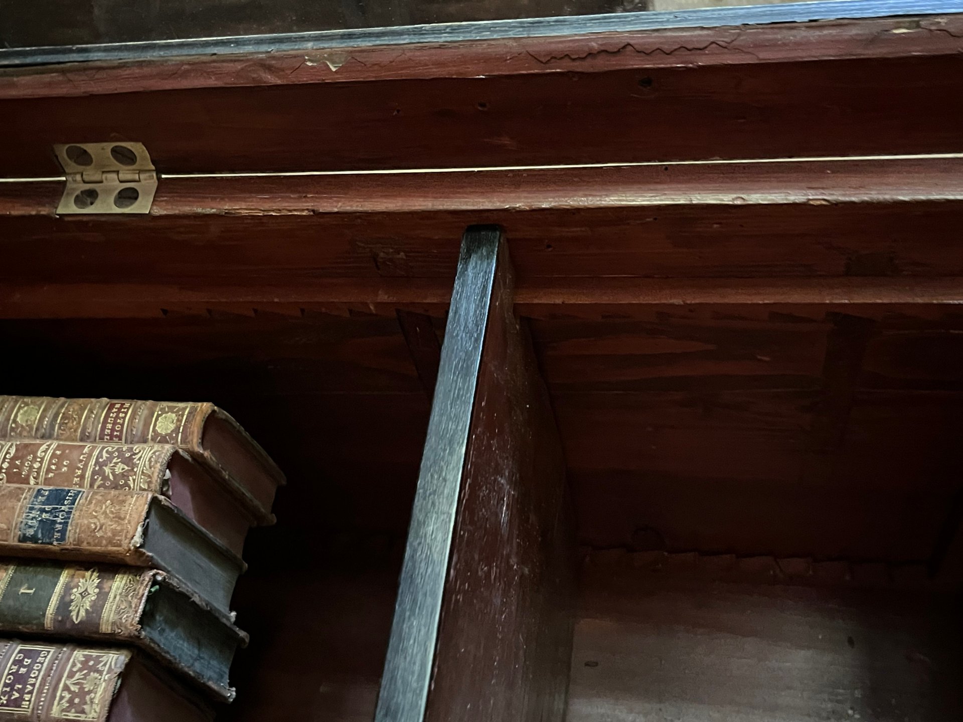 Elle repose sur deux pieds miche en façade . Corniches et pieds en poirier noirci . Les étagères , ferrures et serrures sont d’origine . Les vitres sont anciennes , peut-être d’origine mais il est difficile de l’affirmer avec certitude .