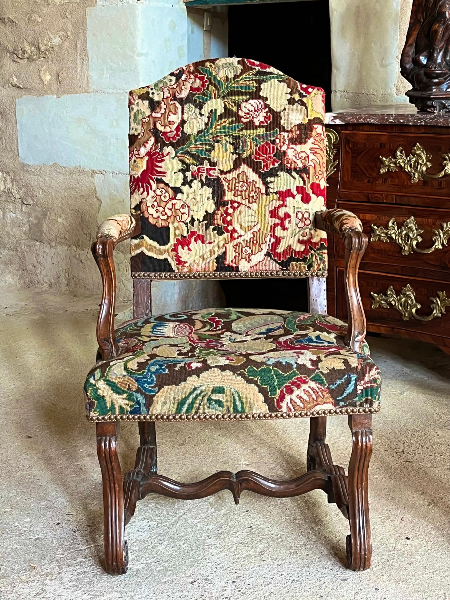 La tapisserie à motifs floraux du siège situé a gauche sur la photo est en bon état général aux couleurs très fraîches . Quelques usures et un petit trou sur le coté du dossier .