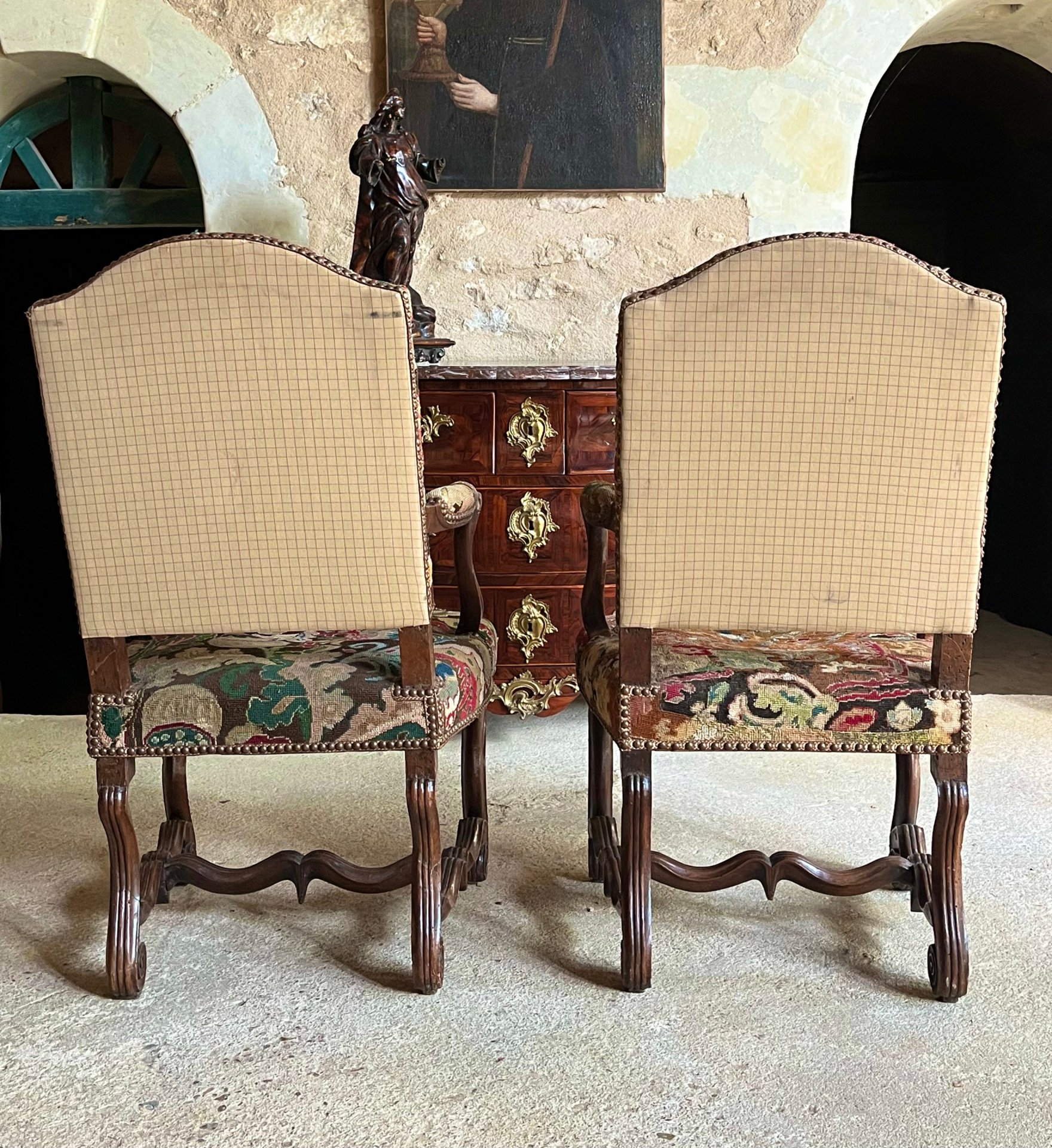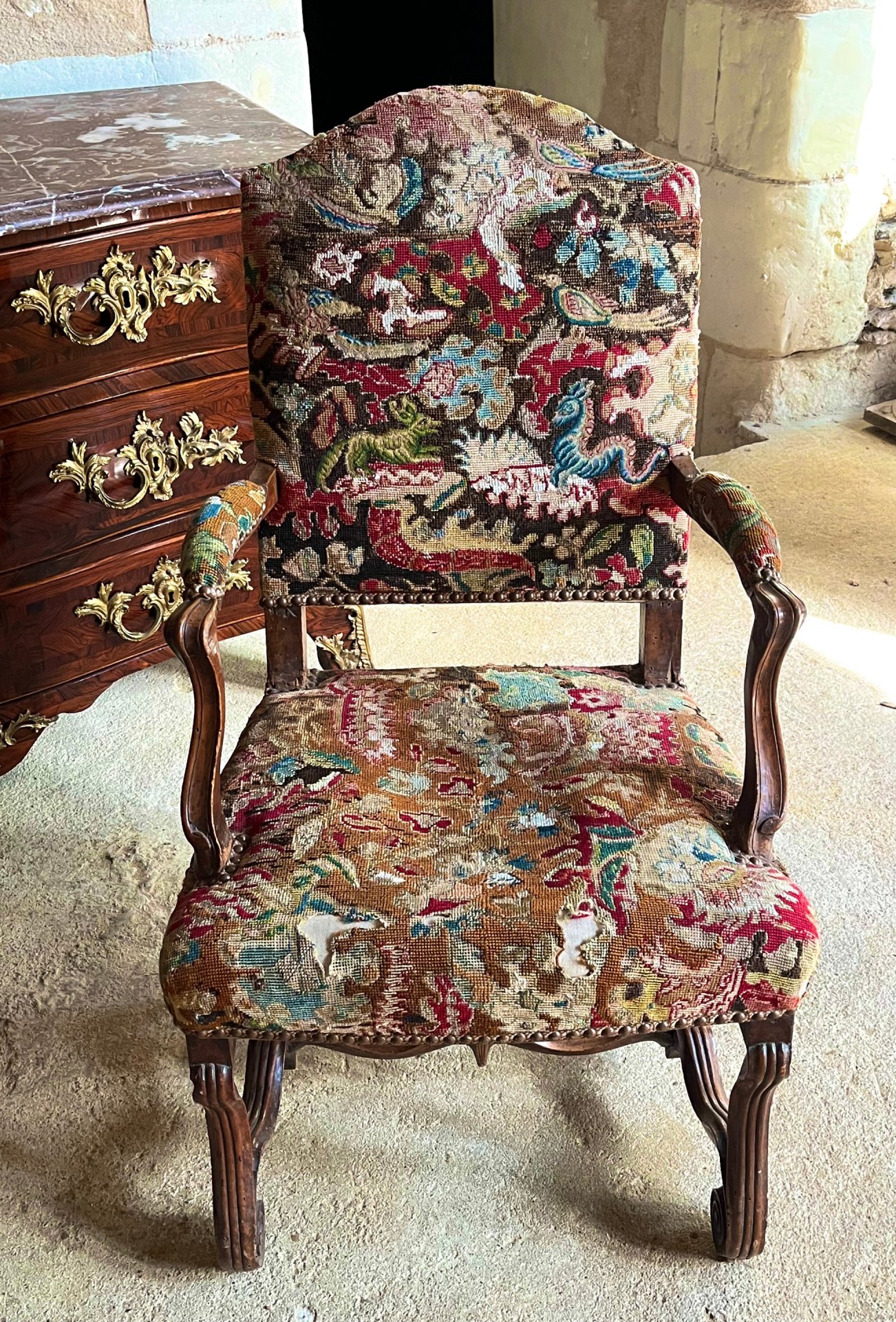 Originale paire de fauteuils recouverts de belles tapisseries anciennes .