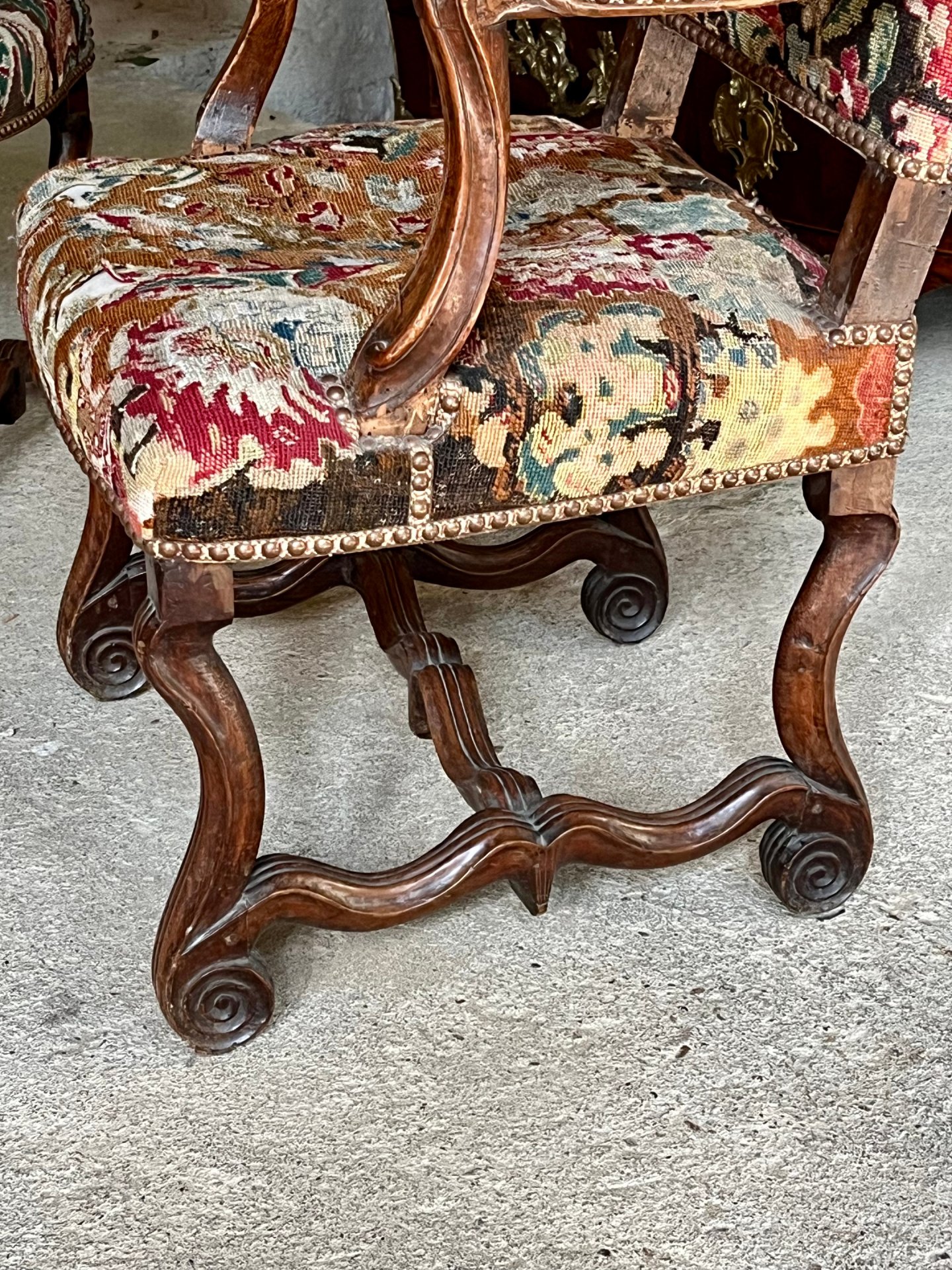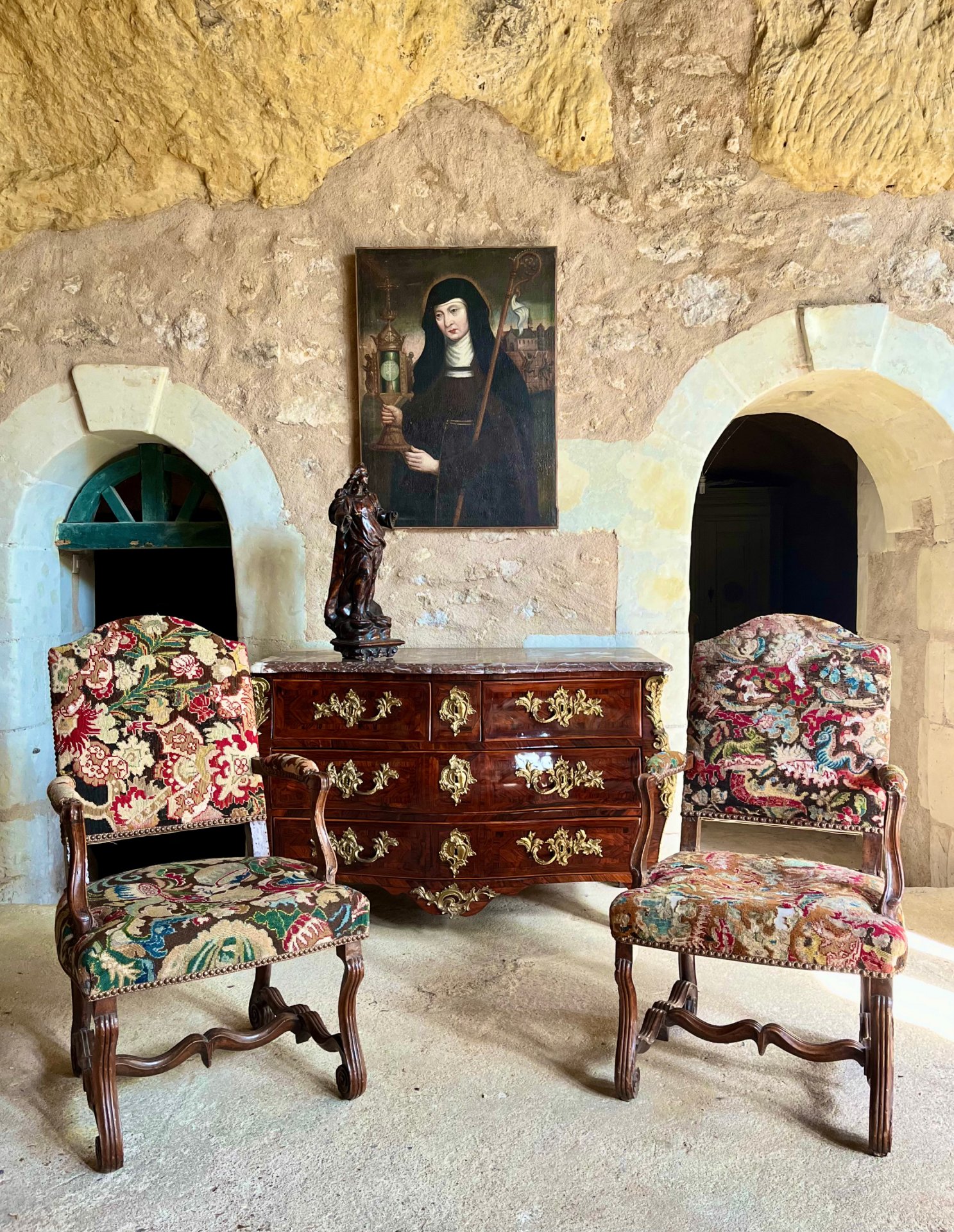 A l’origine , des chaises d’époque XVII ème transformées en fauteuils sous Louis XV avec ajouts de bras et de joues à la ceinture pour arrondir la forme de l’assise .