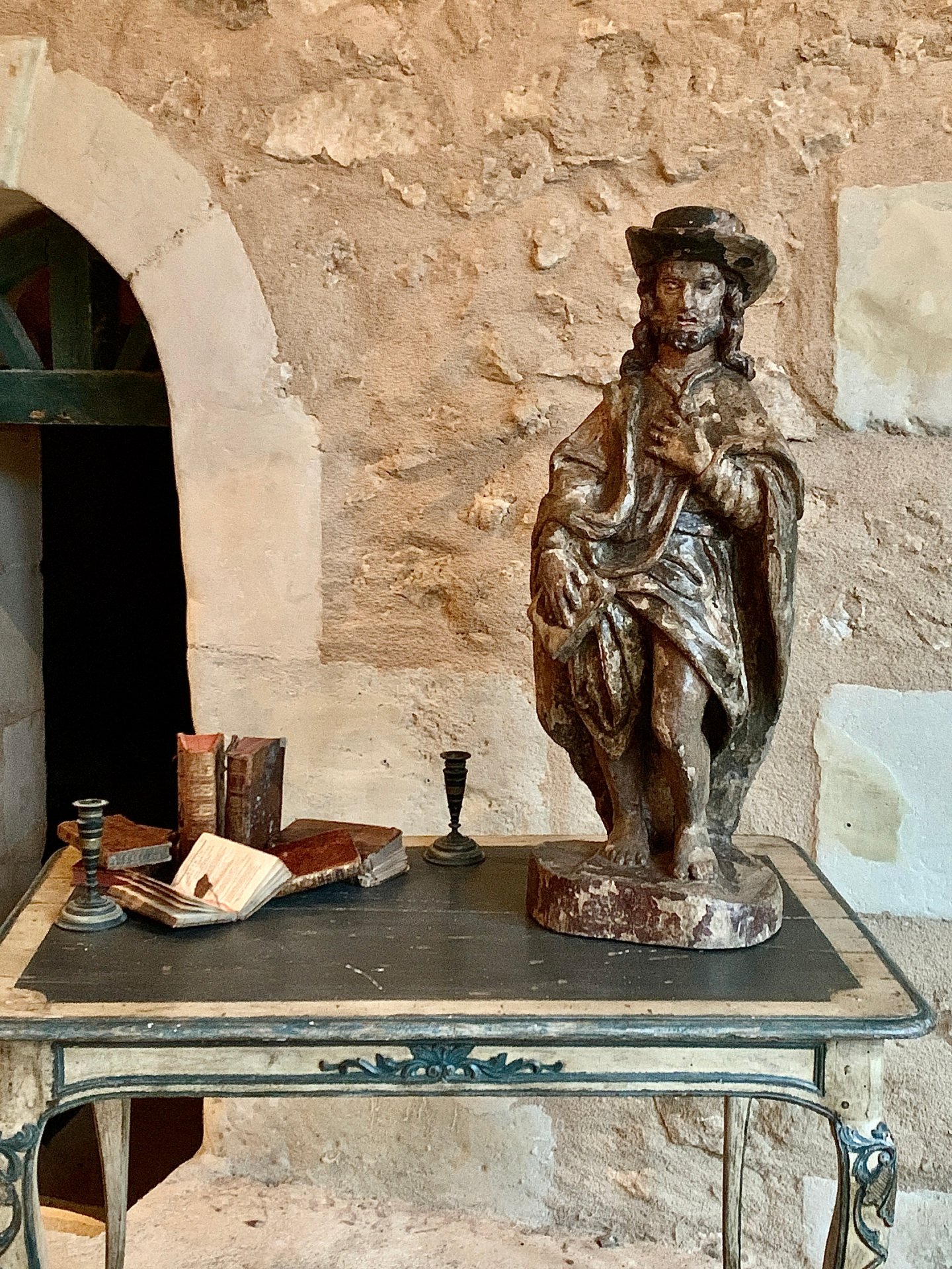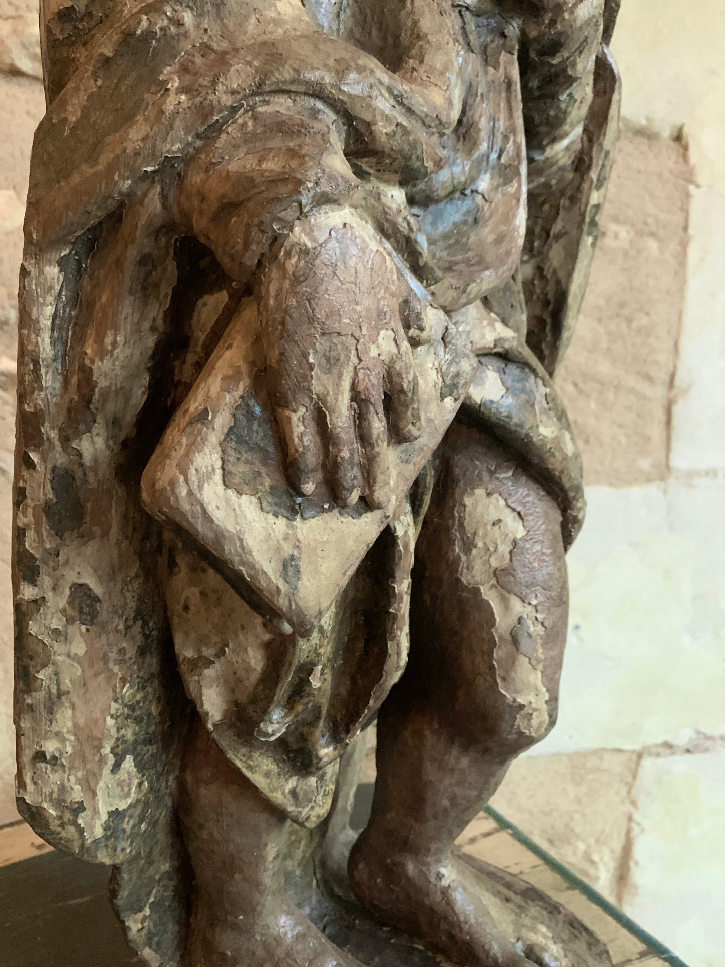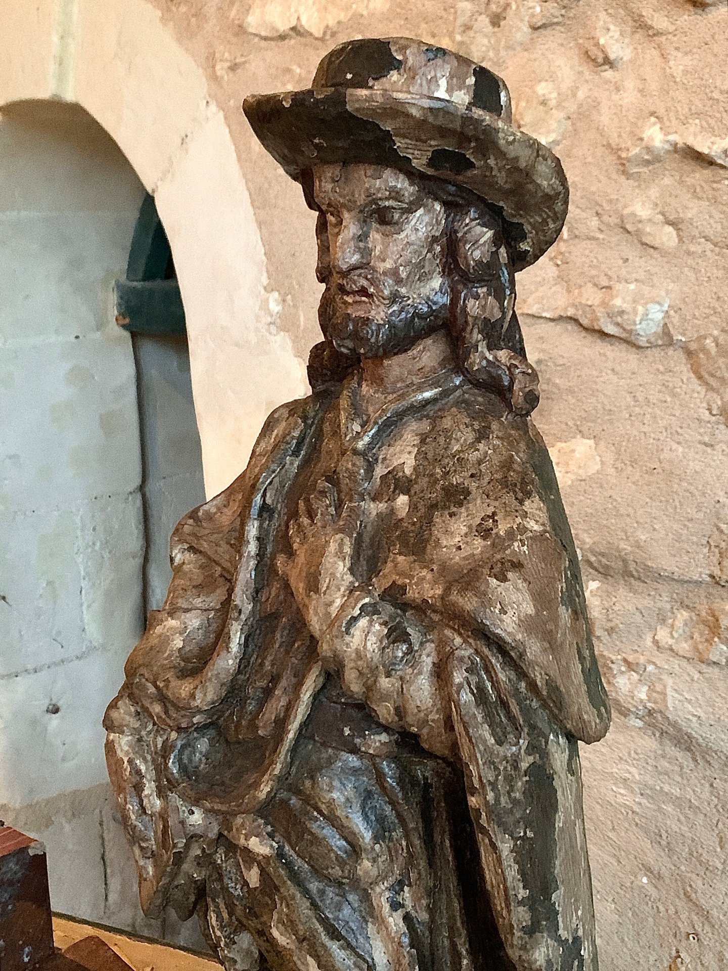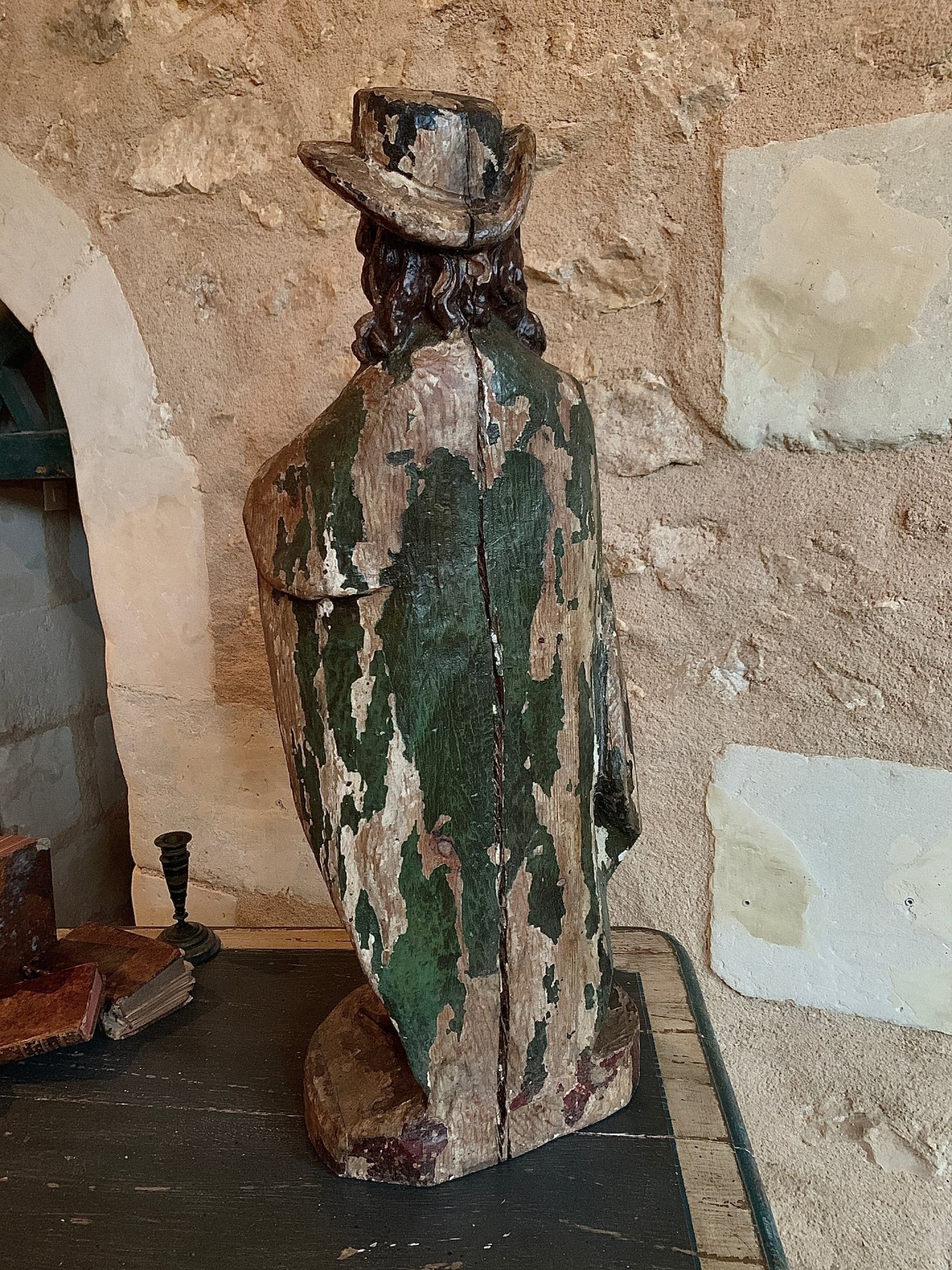Saint Roch , époque XVII ème . En bois sculpté monoxyle ( une seule pièce de bois ) avec importants restes de la polychromie d’origine .