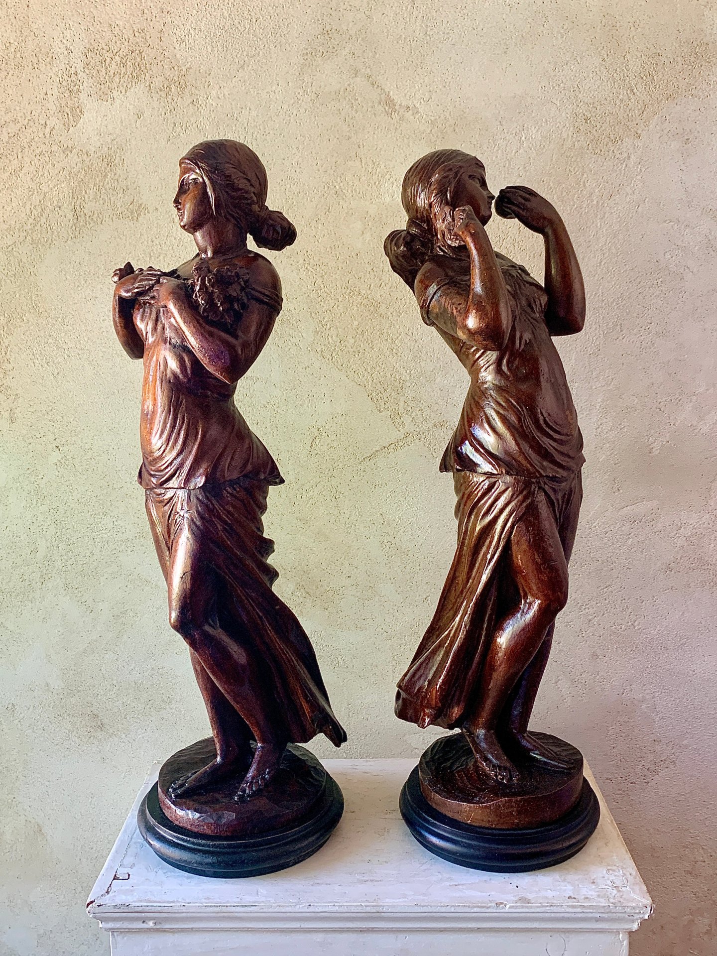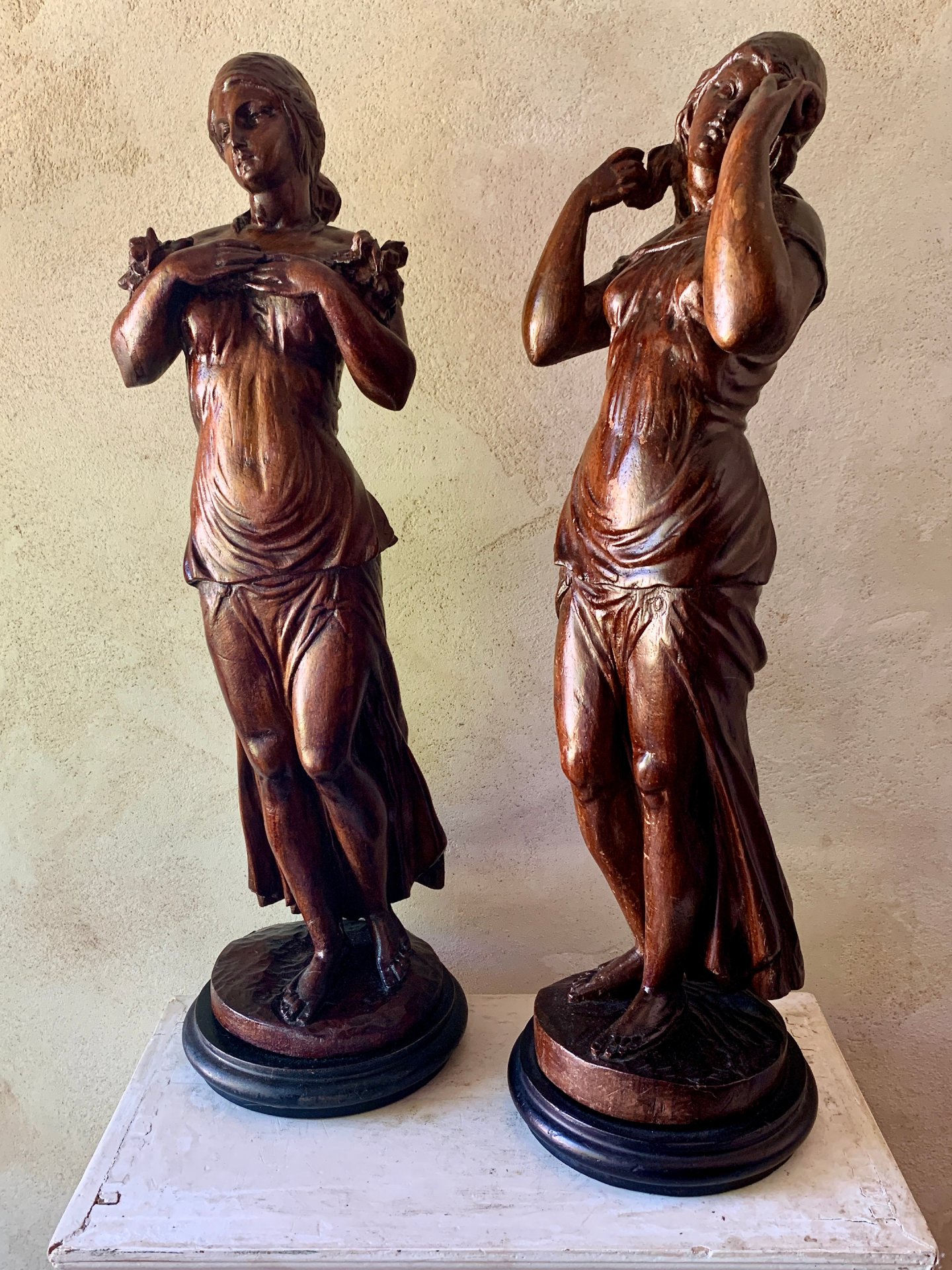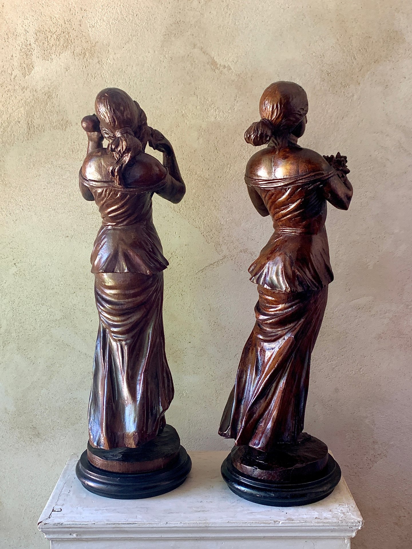 Sculptures d'atelier, travail d'école d'après des modèles de Michel Ange. Elle représentent deux jeunes femmes drapées portant l'une une brassée de fleurs, l'autre une pomme.