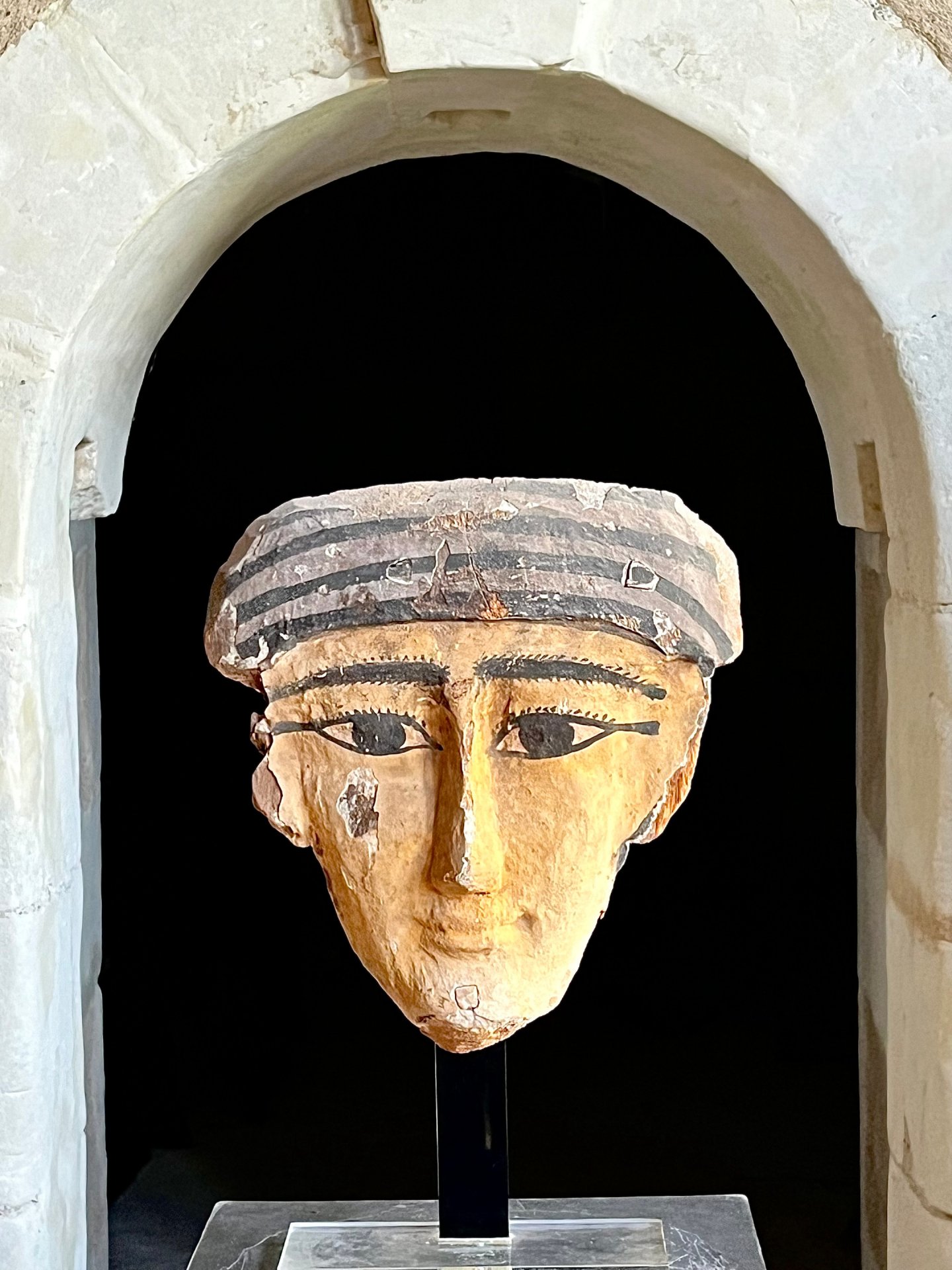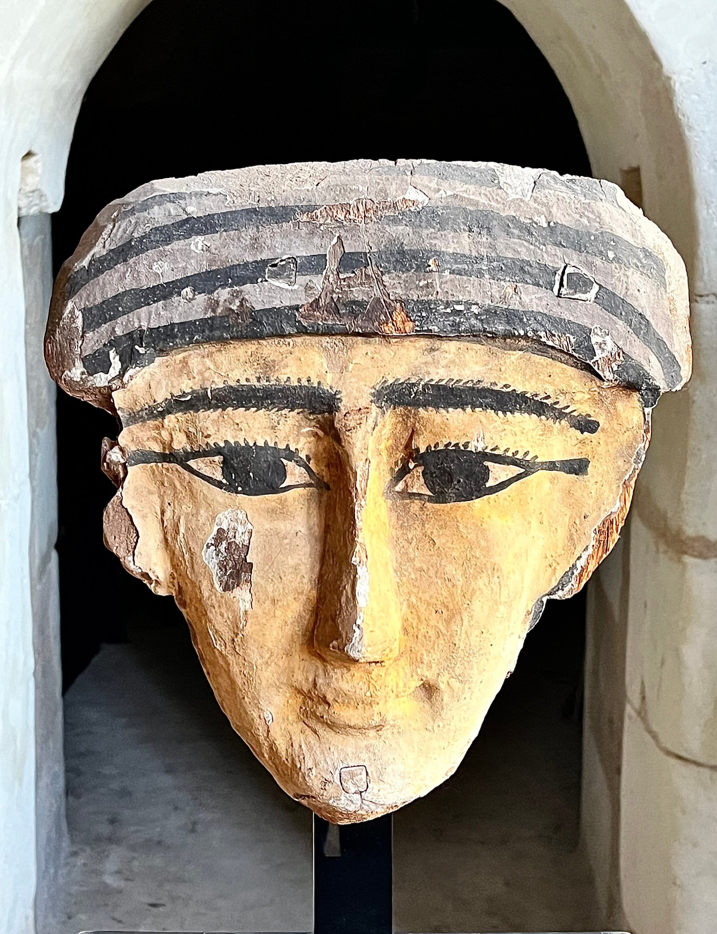 This mask was part of a wooden anthropoid coffin. These coffins were usually constructed from several pieces, the coffin itself, then the face, wig and hands which were added after being made separately.