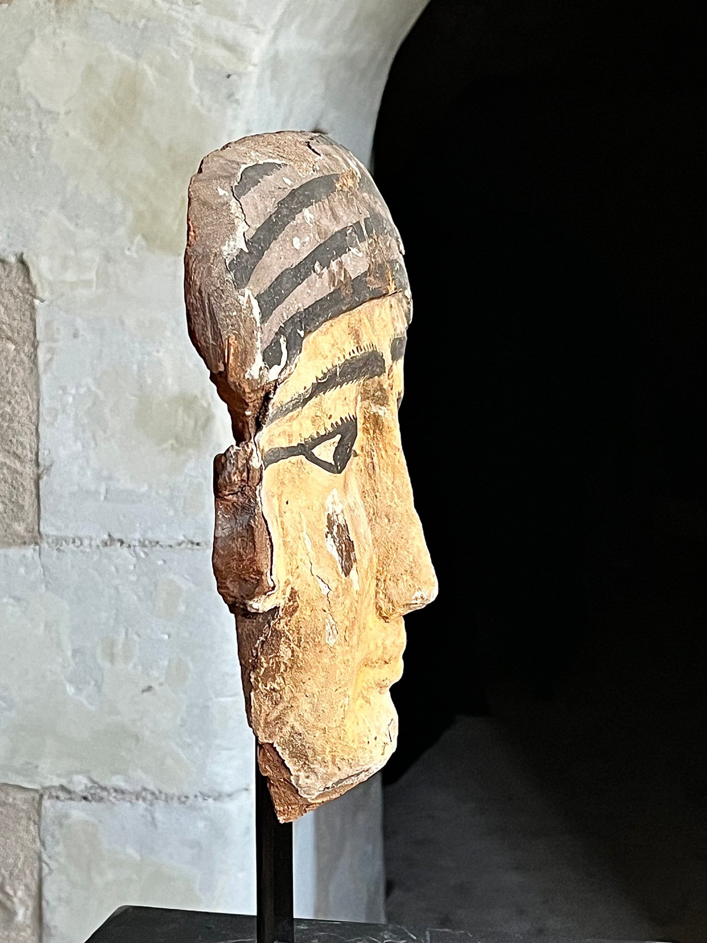 Face of a man with ocher yellow complexion, black and white pigments. The top of a striated tripartite wig, the almond-shaped eyes drawn towards the temples, the eyebrows clearly marked with a thick black line, the edges of the eyes and the pupils are painted black.