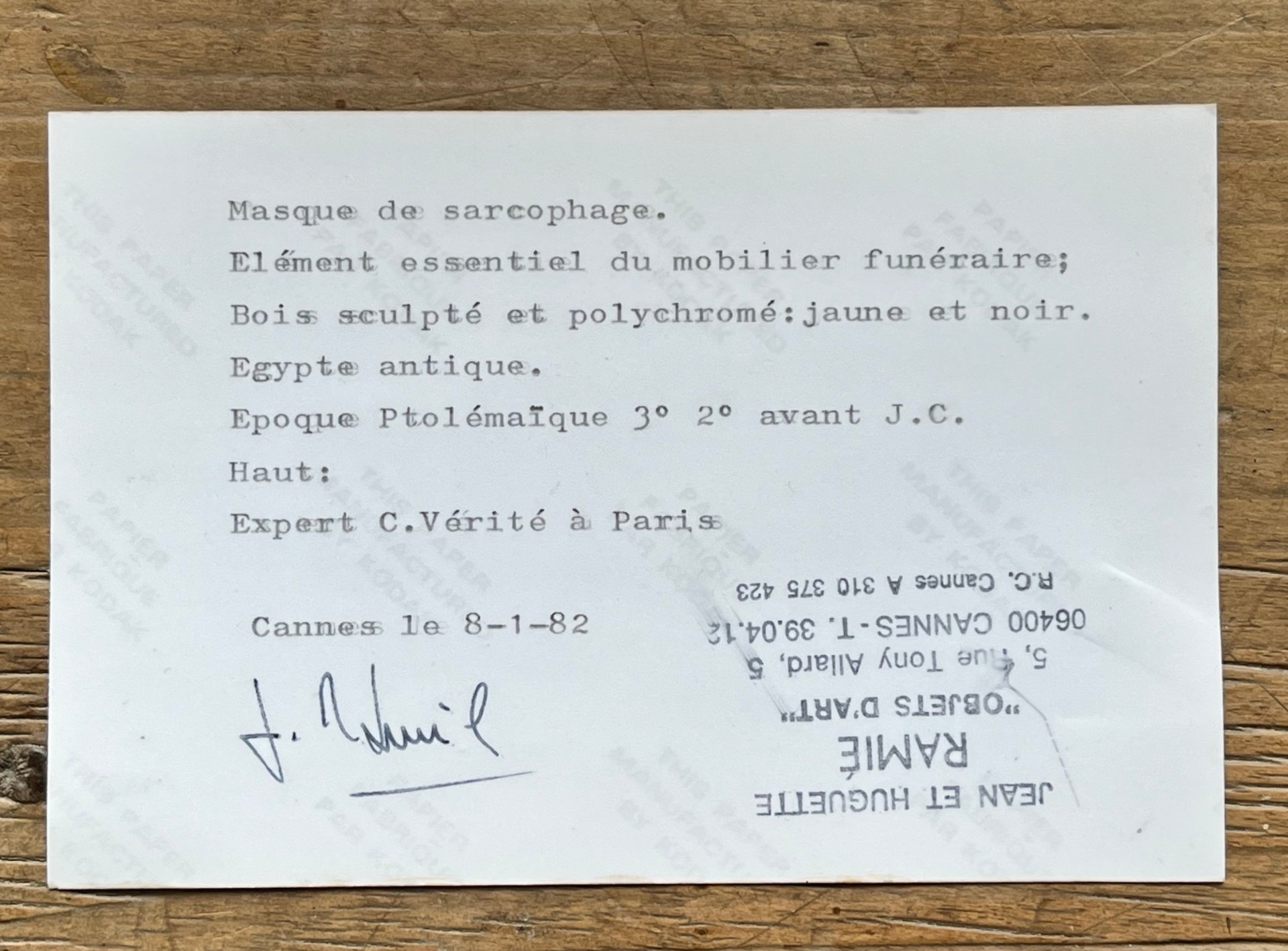 Expertise made by C. Vérité, Paris on the back of the photo in 1982.