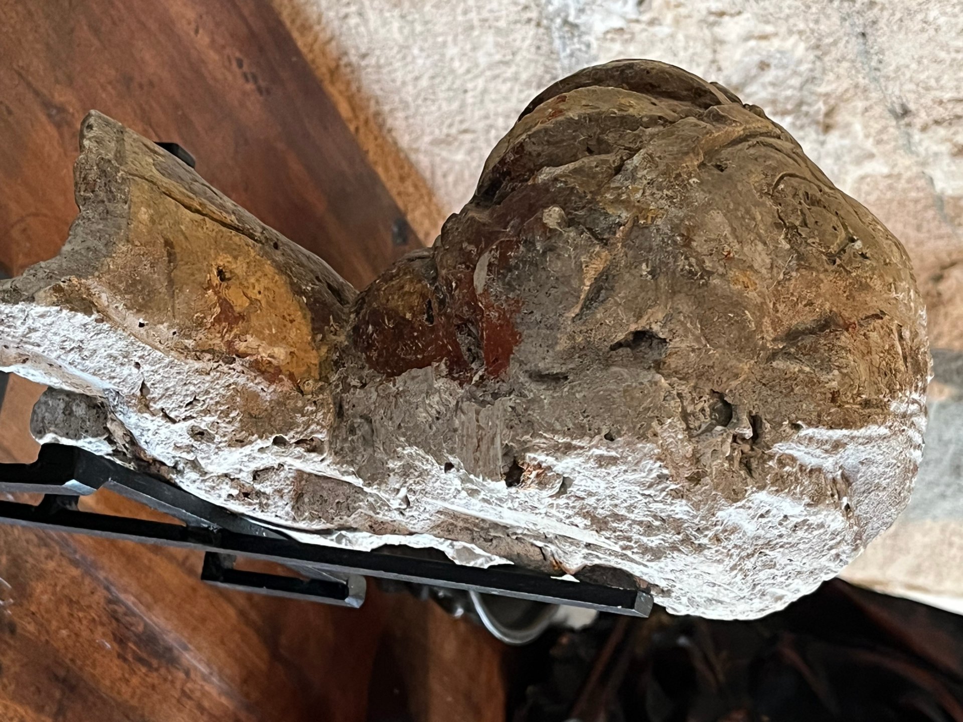Partie supérieure d’un blason (vraisemblablement d’un marquis ) en pierre calcaire avec traces de polychromie .