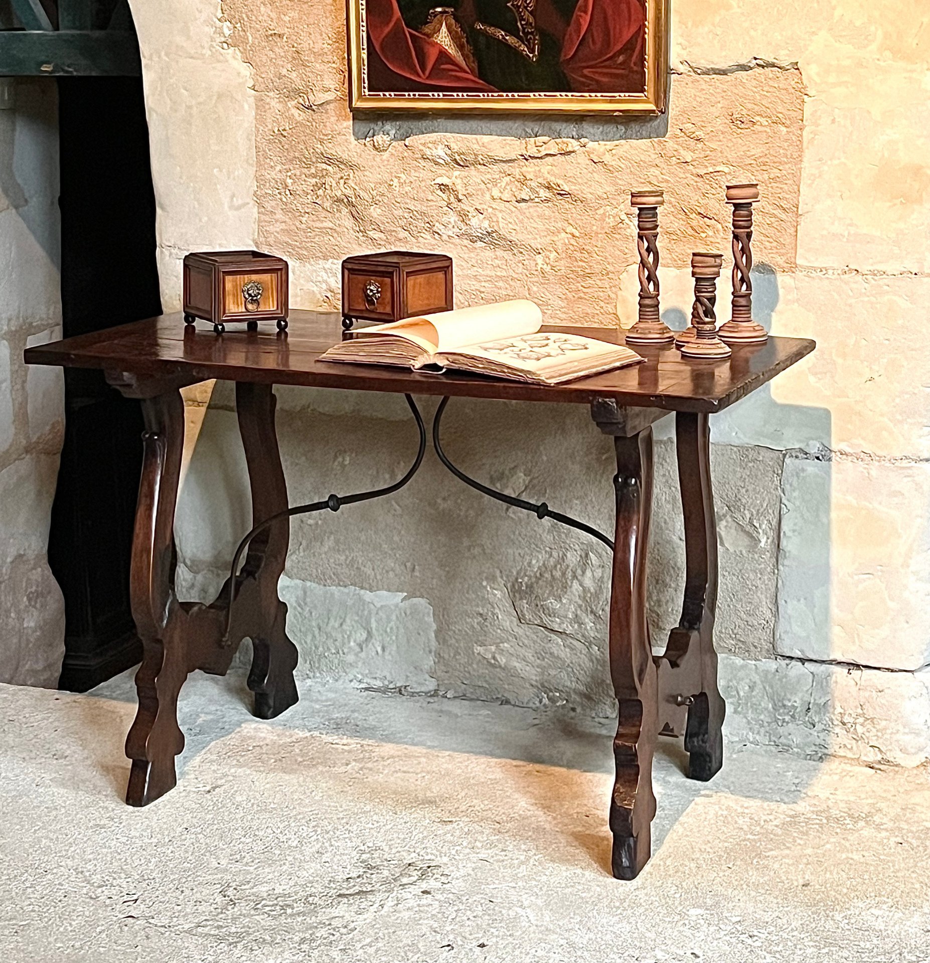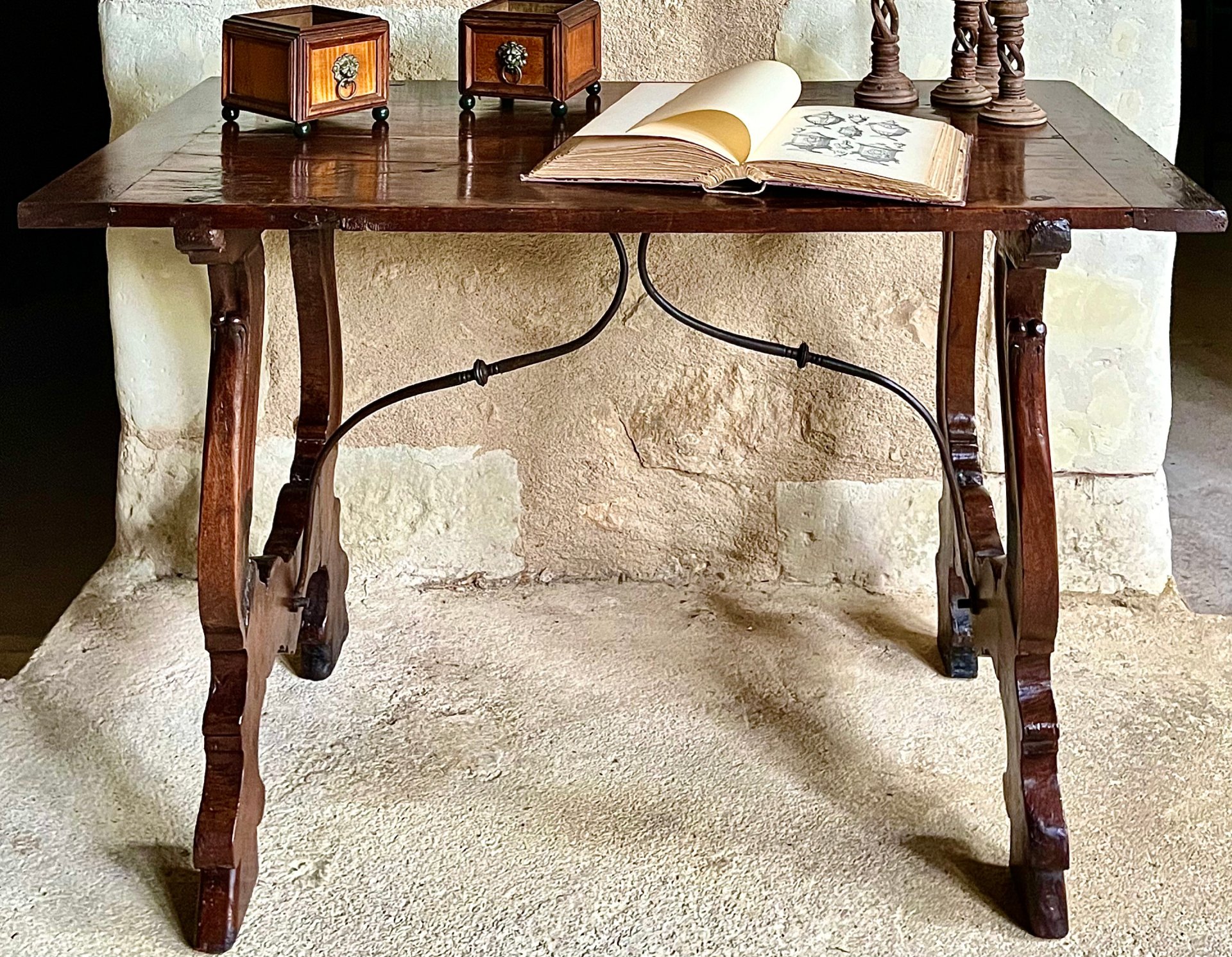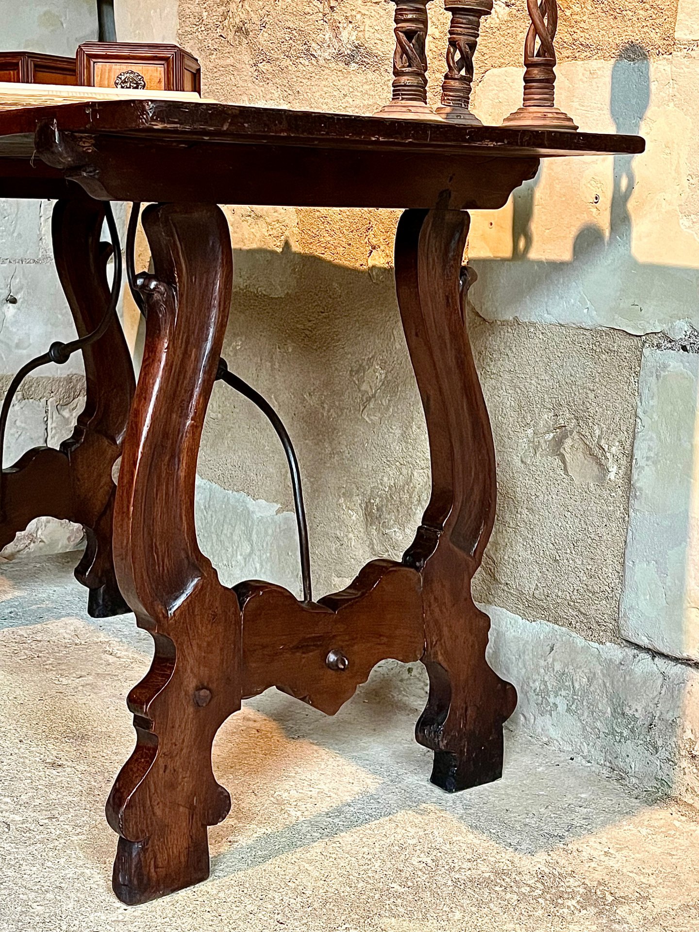 Piètement réuni par une entretoise en fer forgé. Belle patine .