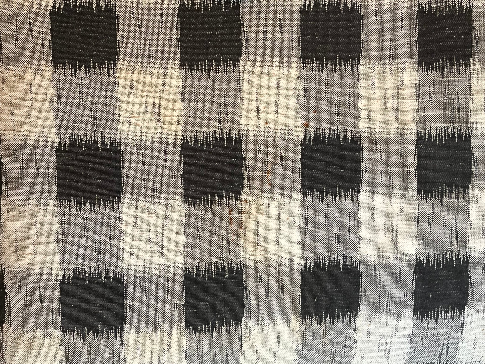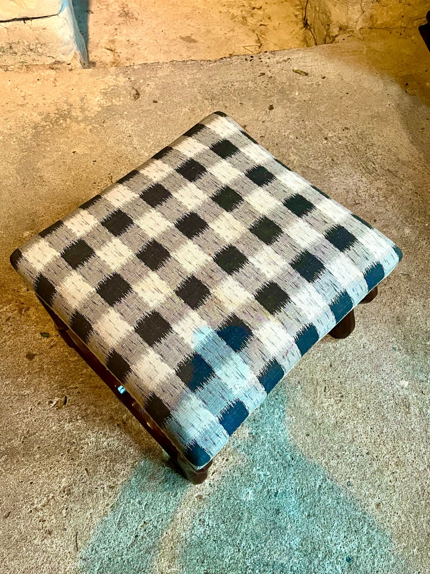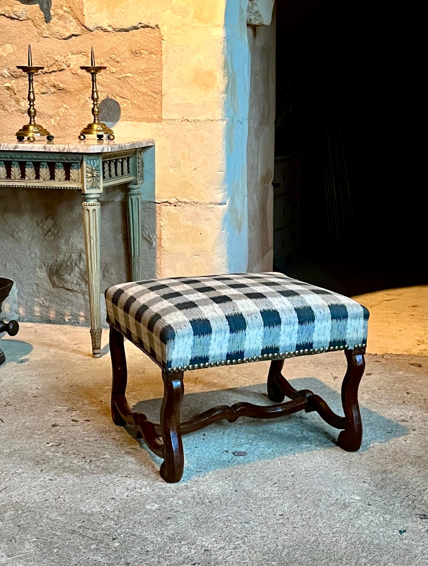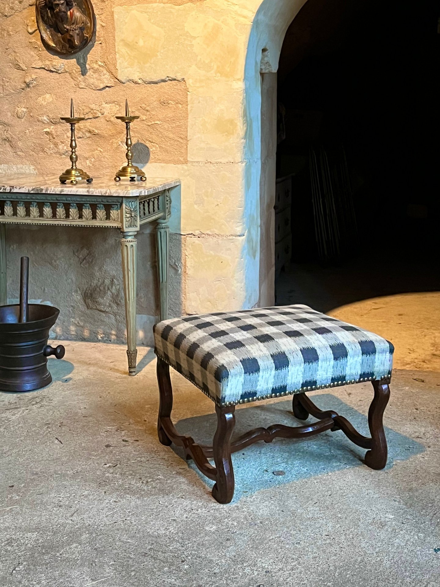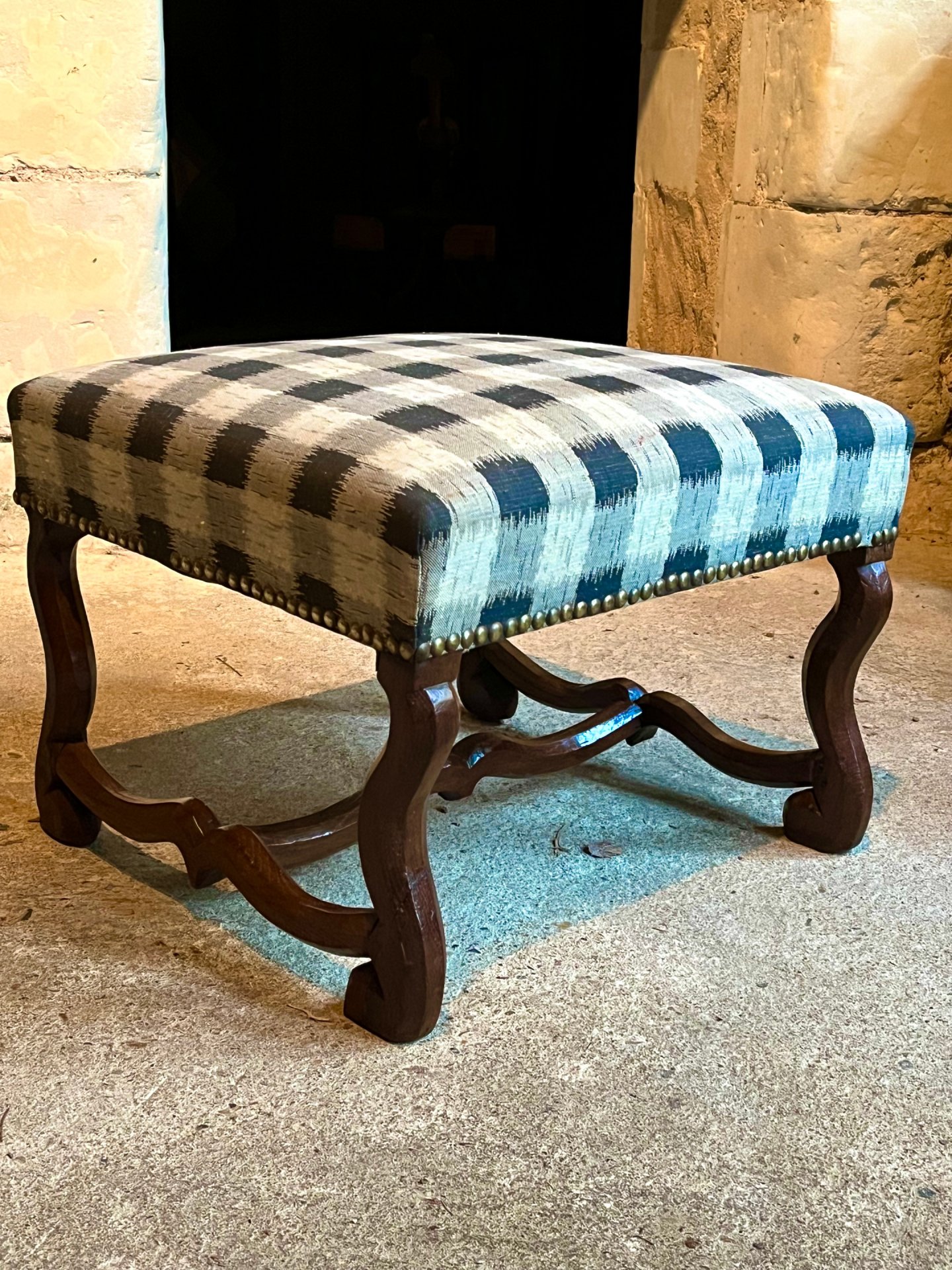 Grand tabouret carré en chêne , piètement os de mouton , pieds à volutes et entretoise découpée .