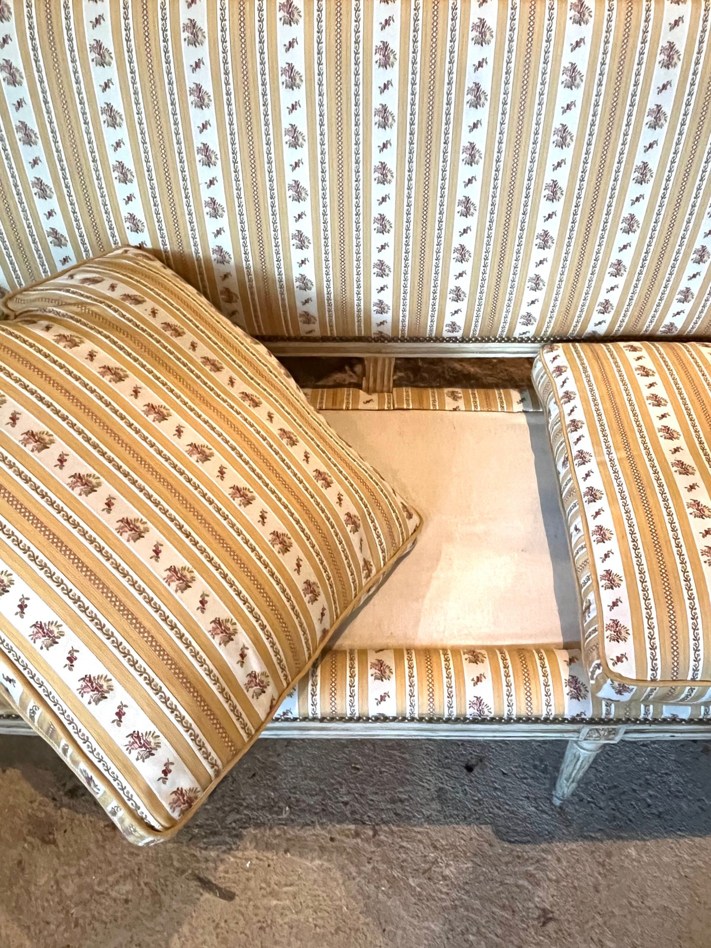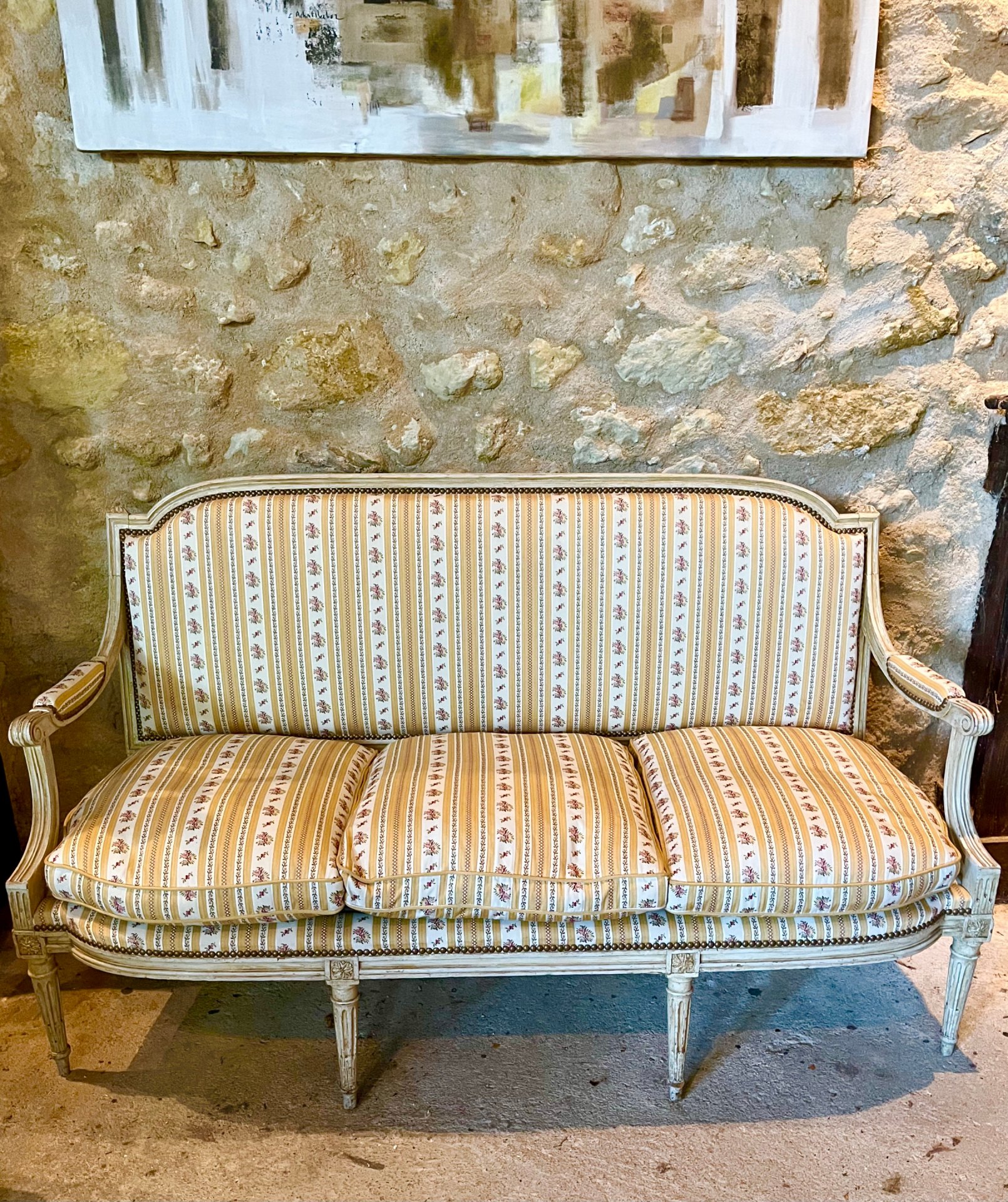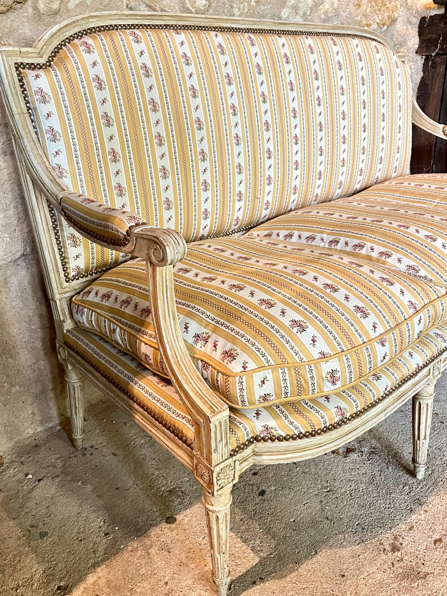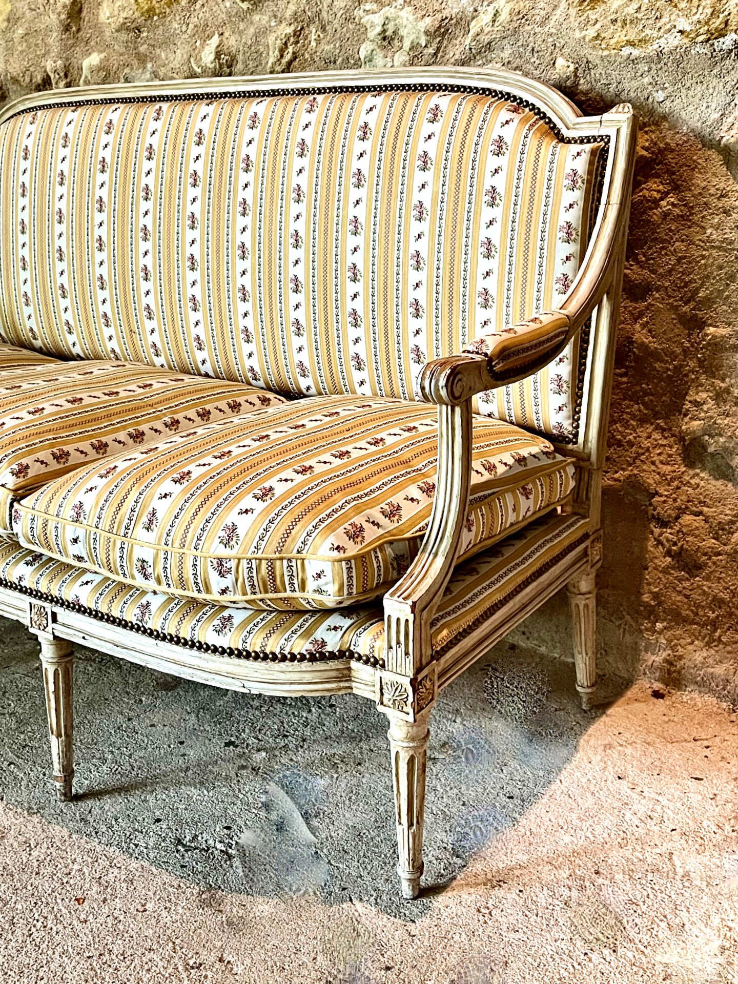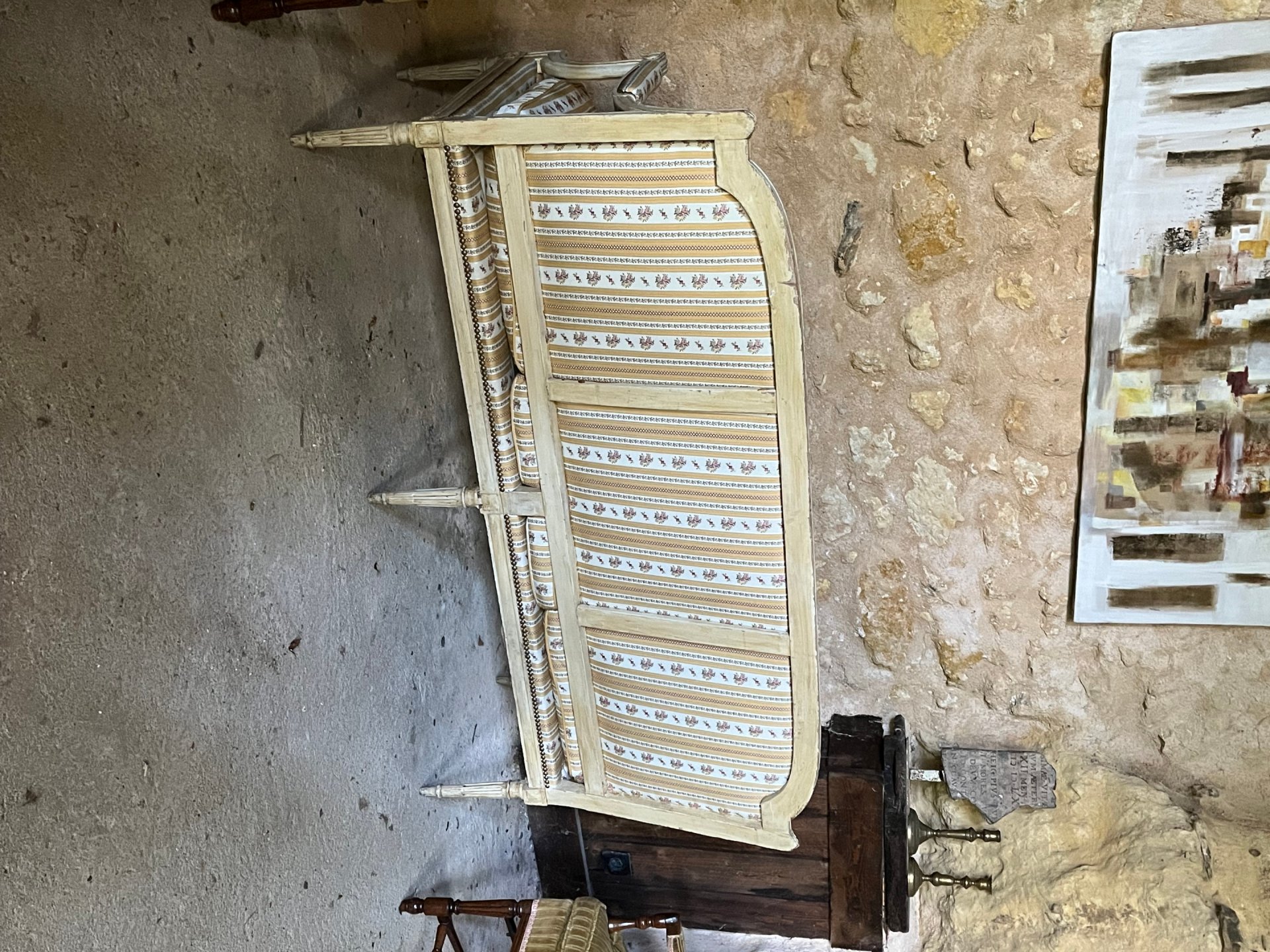 Jolie banquette d’époque Louis XVI en bois peint . Façade légèrement cintrée .