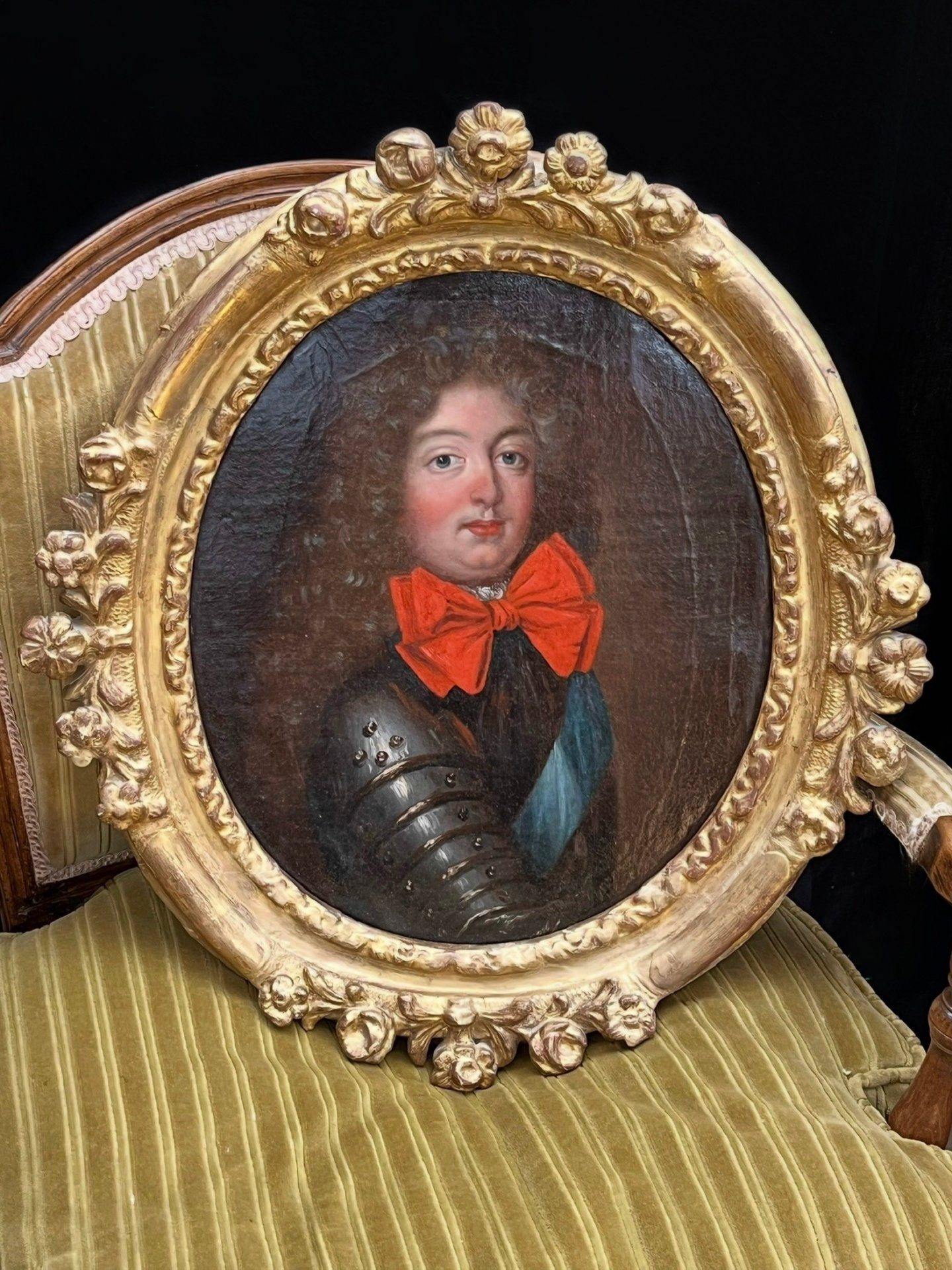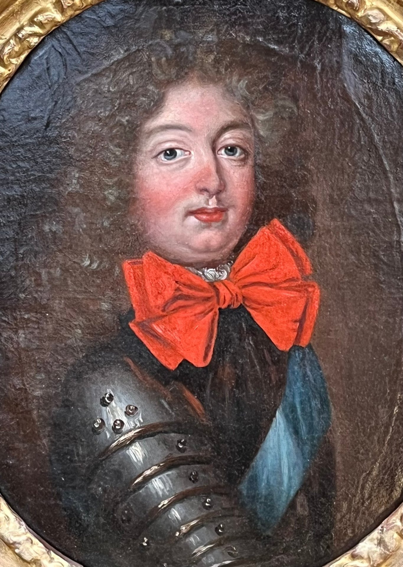 Portrait of the Grand Dauphin, Louis of France (1661-1711) depicted in armor and wearing on his chest the blue ribbon of the order of the Knights of the Holy Spirit. Oil on canvas, 17th century, in its original frame in beautifully carved gilded wood. Frame 53 cm x 48 cm. View 37 cm x 31 cm.