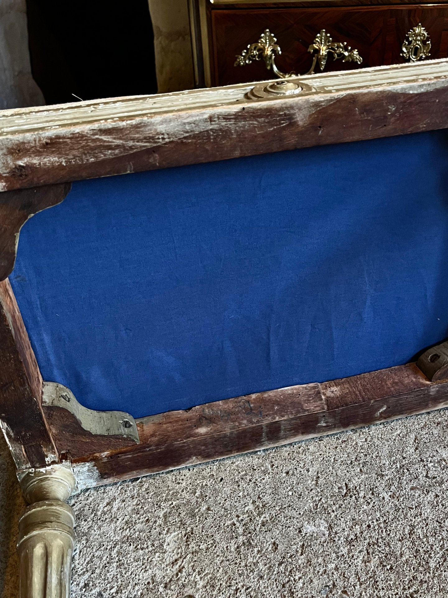 En bois laqué gris-vert , recouvert d’une très belle soie brochée .